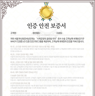 고객님의 안전을 위해 안전보증서를 발급하고 있습니다. 안전보증서는 수술하시는 고객님께 안전한 검사와 수술을 보장해드리고